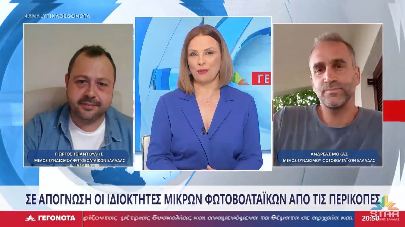 Για την απόγνωση που βιώνουν οι ιδιοκτήτες των μικρών φωτοβολταϊκών μέχρι 500 kw από τις περικοπές, μίλησαν στα αναλυτικά γεγονότα του STAR Κεντρικής Ελλάδας με τη Λένα Παρασκευά, στις 2 Ιουνίου 2025, τα μέλη του Συνδέσμου Φωτοβολταϊκών Ελλάδας (ΣΥΦΩΕΛ), Γιώργος Τσιαντούλης και Ανδρέας Μόκας.